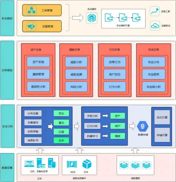 唐槐态势感知与安全运营平台全方位采集和分析各类威胁检测事件和日志,包括网络设备,安全设备,主机,终端,应用服务,虚拟化和云基础设施;打通安全事件平台和安全响应平台,统一关联事件,情报,资产和用户,发现安全攻击,追踪异常用户和阻止潜在威胁;提升和扩展威胁检测能力,将安全分析师的人工分析能力编排为自动化执行,自动化的分析和处置更加准确和及时,适合快速和大规模的部署应用。